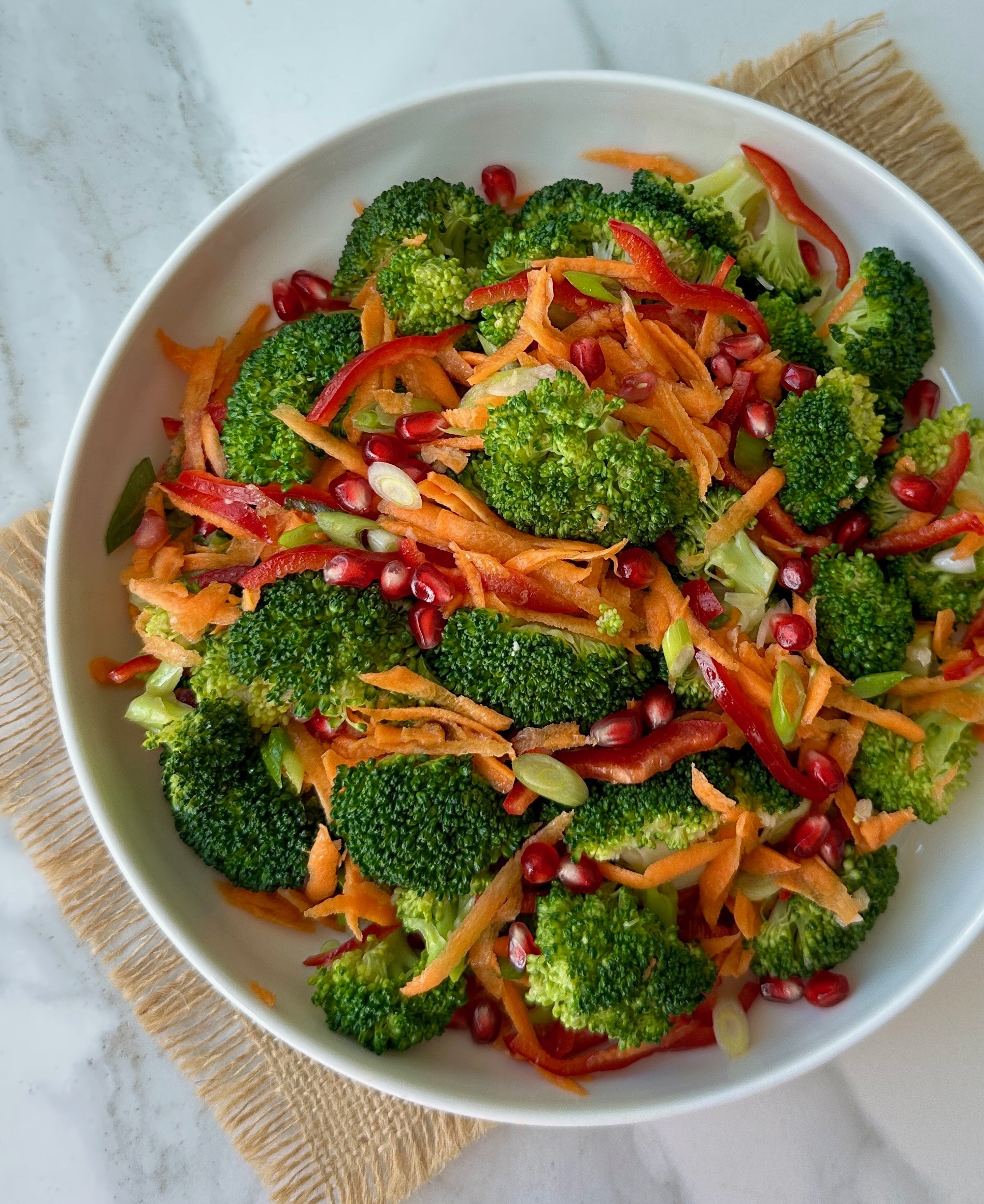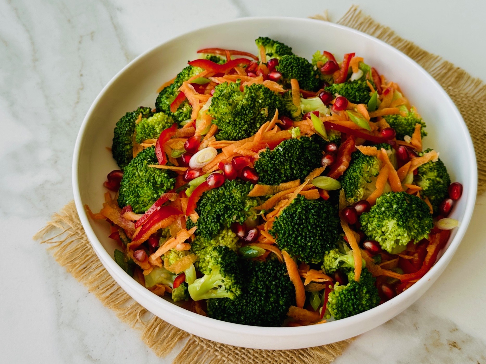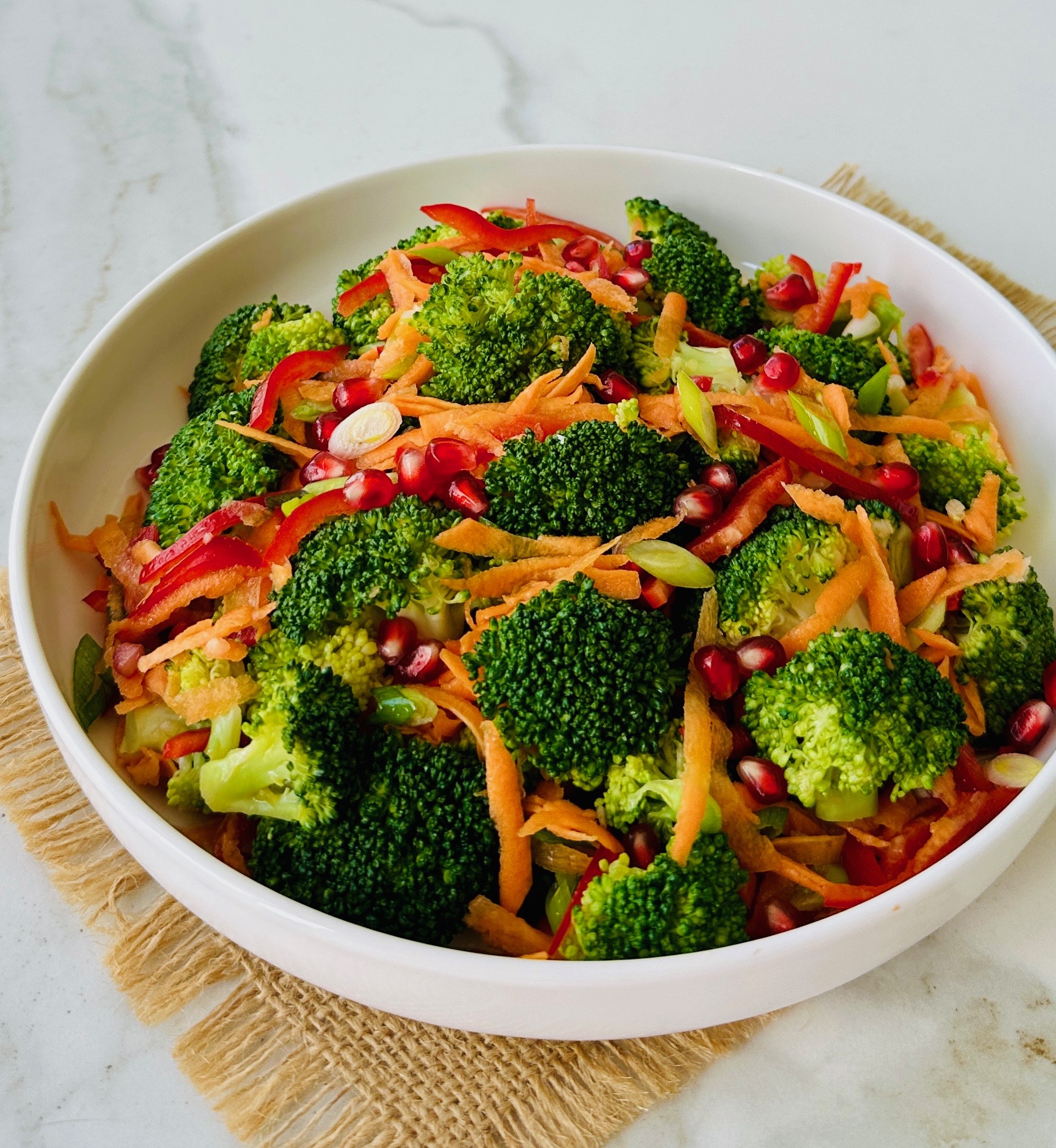 *Kapya biberin çekirdeğini çıkartıp incecik doğrayın, havucun kabuğunu sebze soyucusu ile soyarak rendenin iri tarafıyla rendeleyin. Soğanları da verev doğrayın. Doğranmış sebzeleri haşlanan brokoliye ekleyin. En son sosu üzerine gezdirip karıştırın. Nar tanelerini salatanın üzerine serpiştirip ılık olarak servis edin.