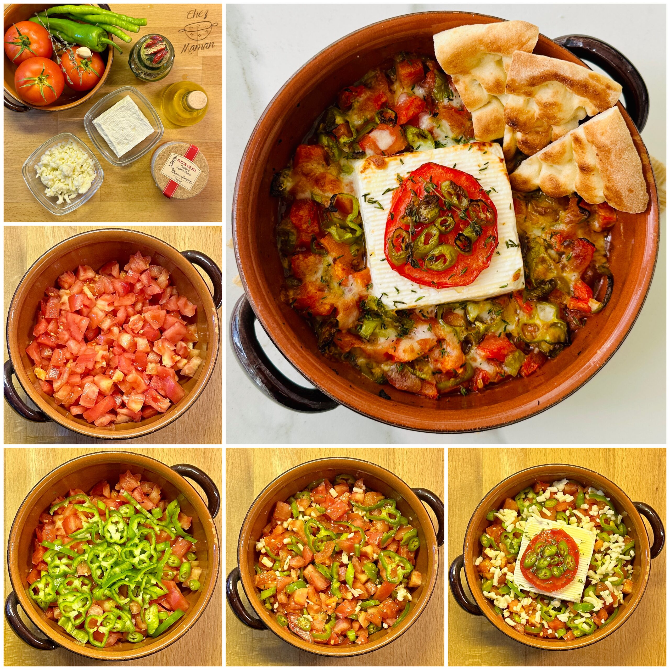 *Domatesli karışımın ortasına beyaz peynir, kenara ayırdığınız dilimlenmiş domates, biberler ve kekiği yerleştirin. Üzerine zeytinyağı gezdirip 200 derecede önceden ısıtılmış fırında peynir kızarana kadar yaklaşık 20 dakika pişirin.