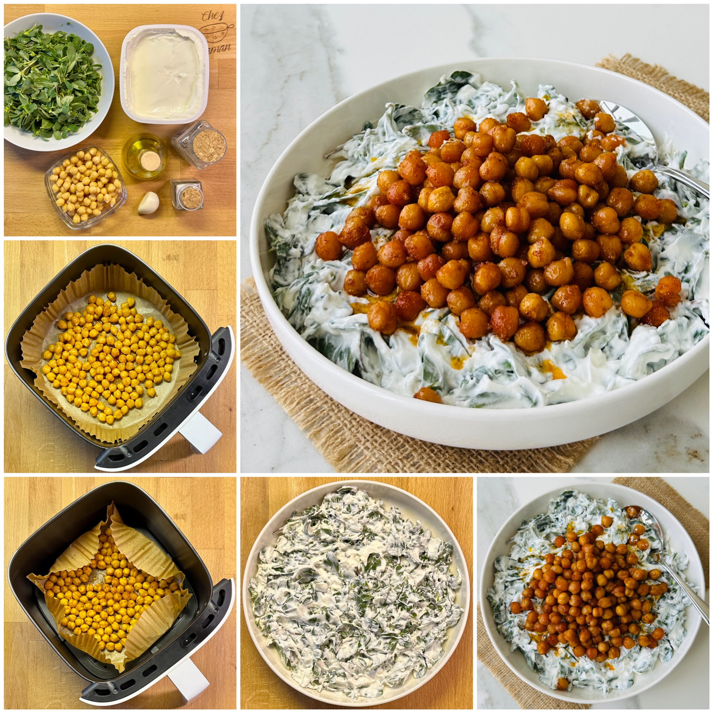 *Nohutlar kızarırken bu arada semizotu yapraklarını yıkayıp süzgeçe alın. Süzme yoğurdu geniş bir kaba aktarıp sarımsak, tuz ve semizotu yapraklarını ilave ederek karıştırın ve servis tabağına yayın. Üzerine kızarmış nohutları serpiştirin.