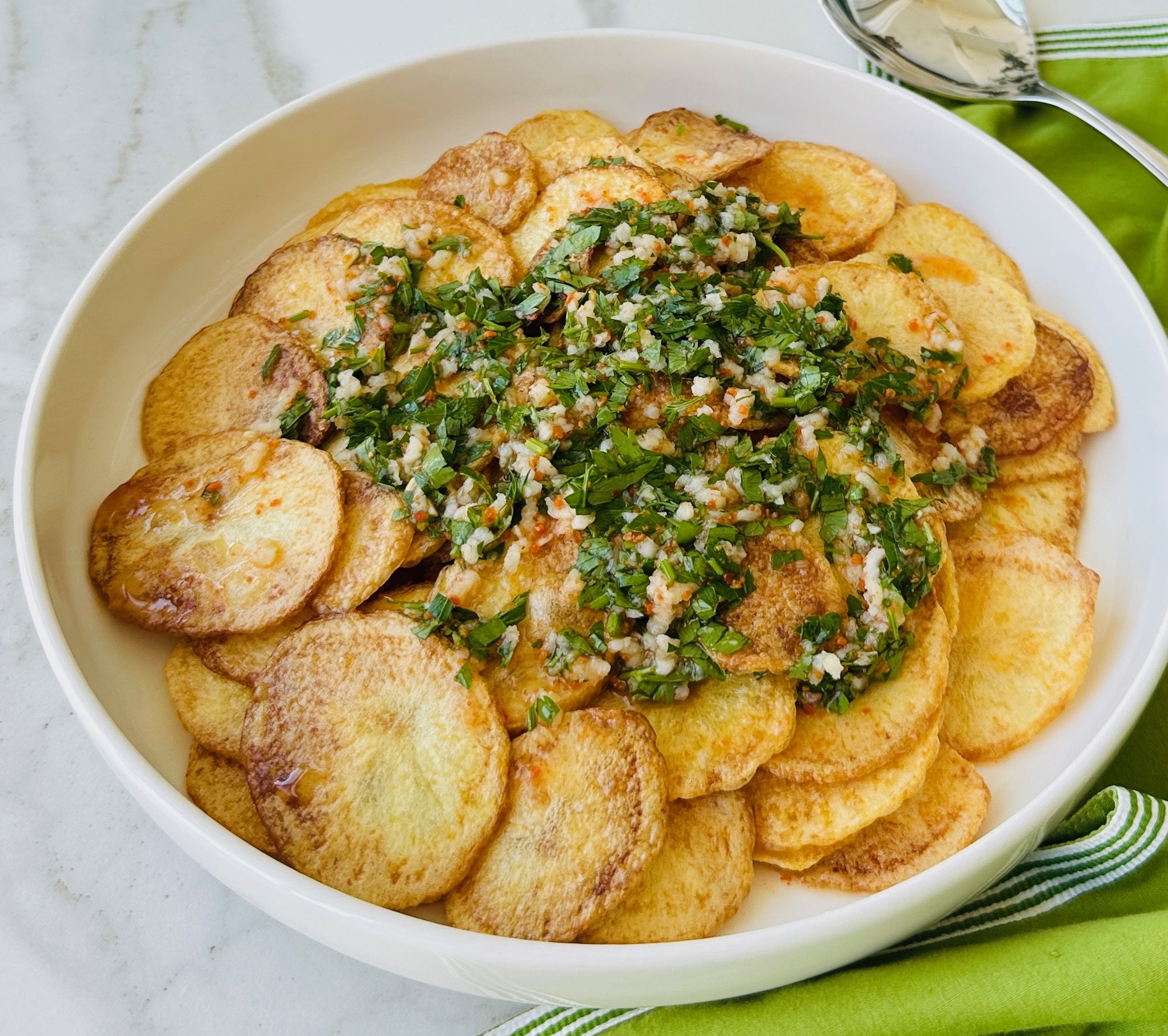 *Sarımsak, limon suyu, pul biber, tuz ve maydanozu bir kasede karıştırıp patateslerin üzerine gezdirin.