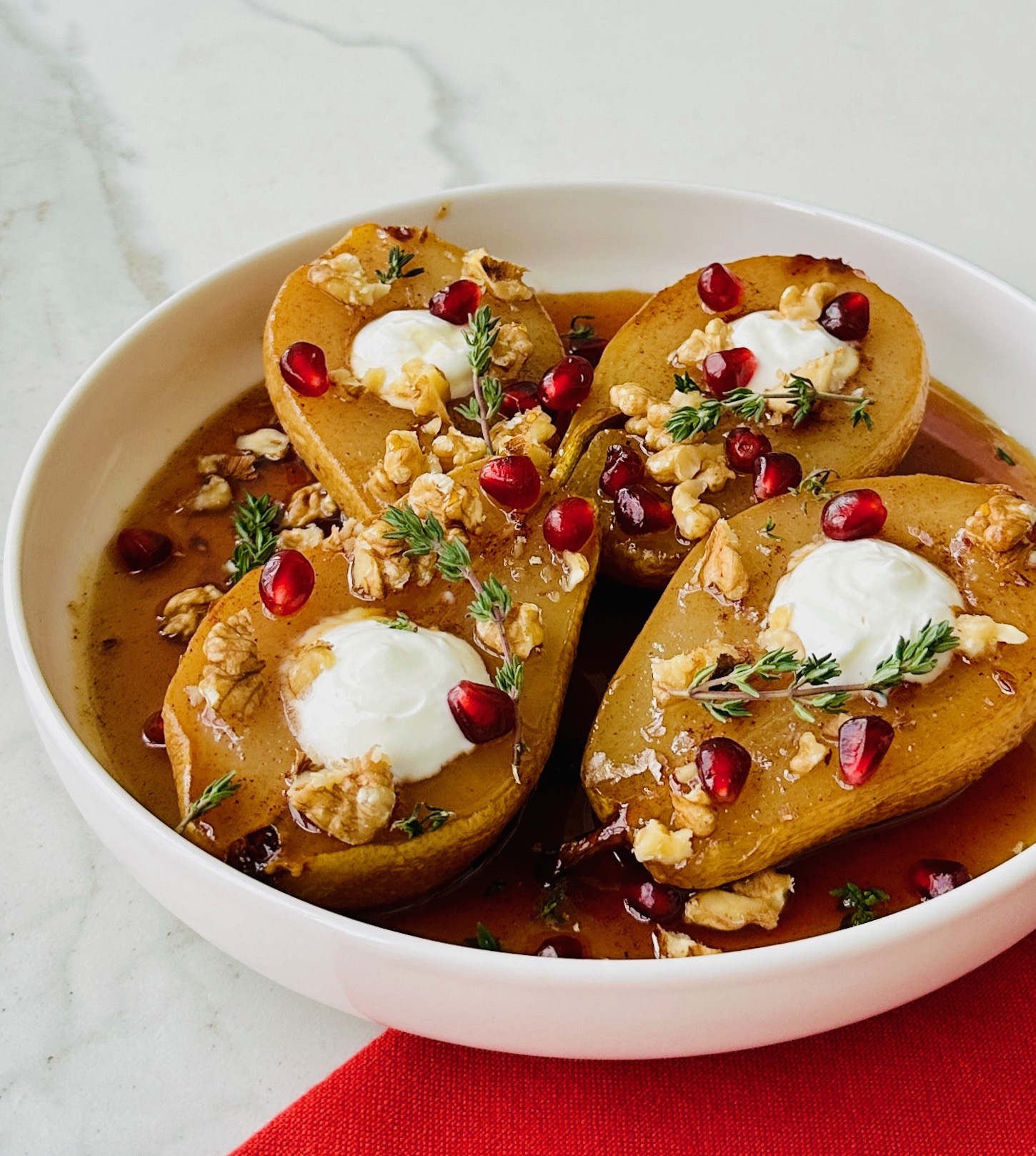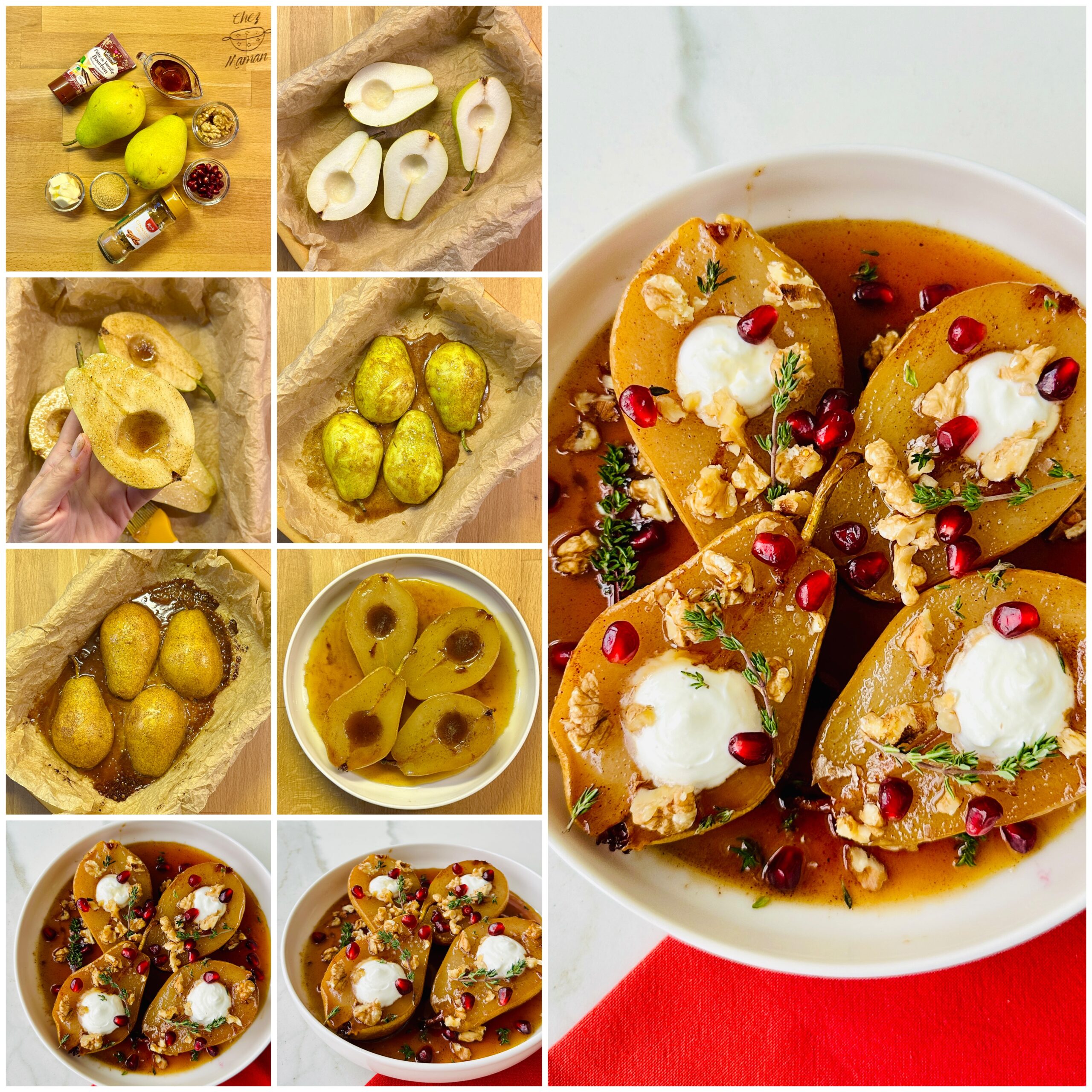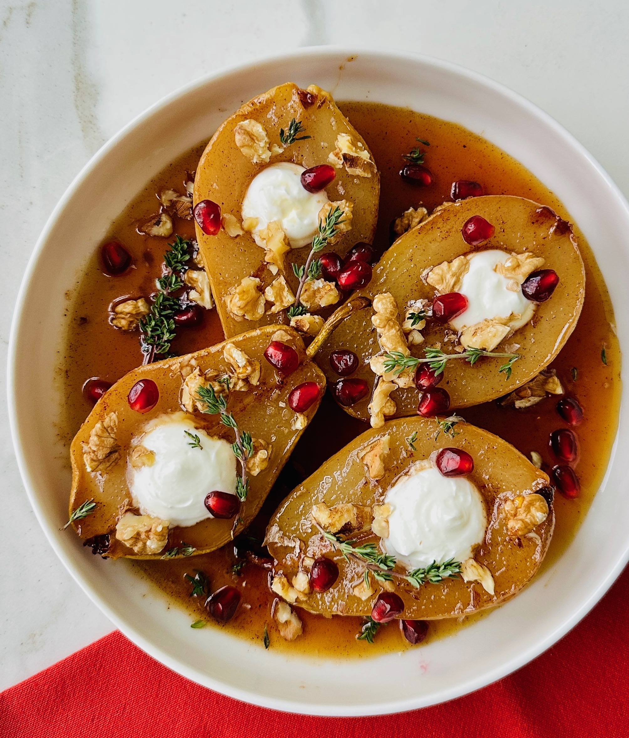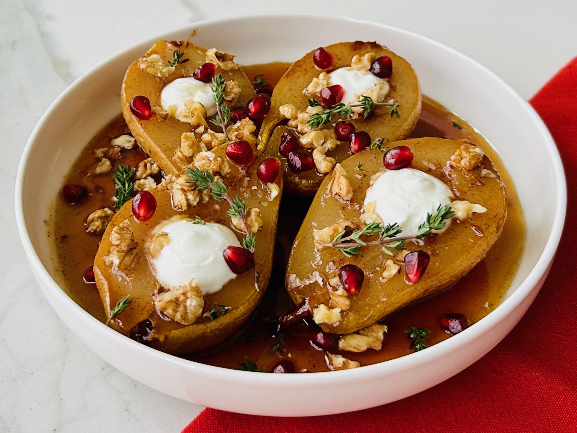 *Tatlıyı fırından çıkardıktan sonra ilk sıcaklığı geçince armutların kesik tarafları üste gelecek gibi servis tabağına geçirin. Fırın kabında kalan sosa 2 – 3 yemek kaşığı mapple şurup ekleyip karıştırarak armutların üzerine akıtın. Armutların oyuk yerlerine krema veya süzme yoğurdu sıkın, taze kekik yaprakları, nar taneleri ve ceviz içi ile süsleyin.