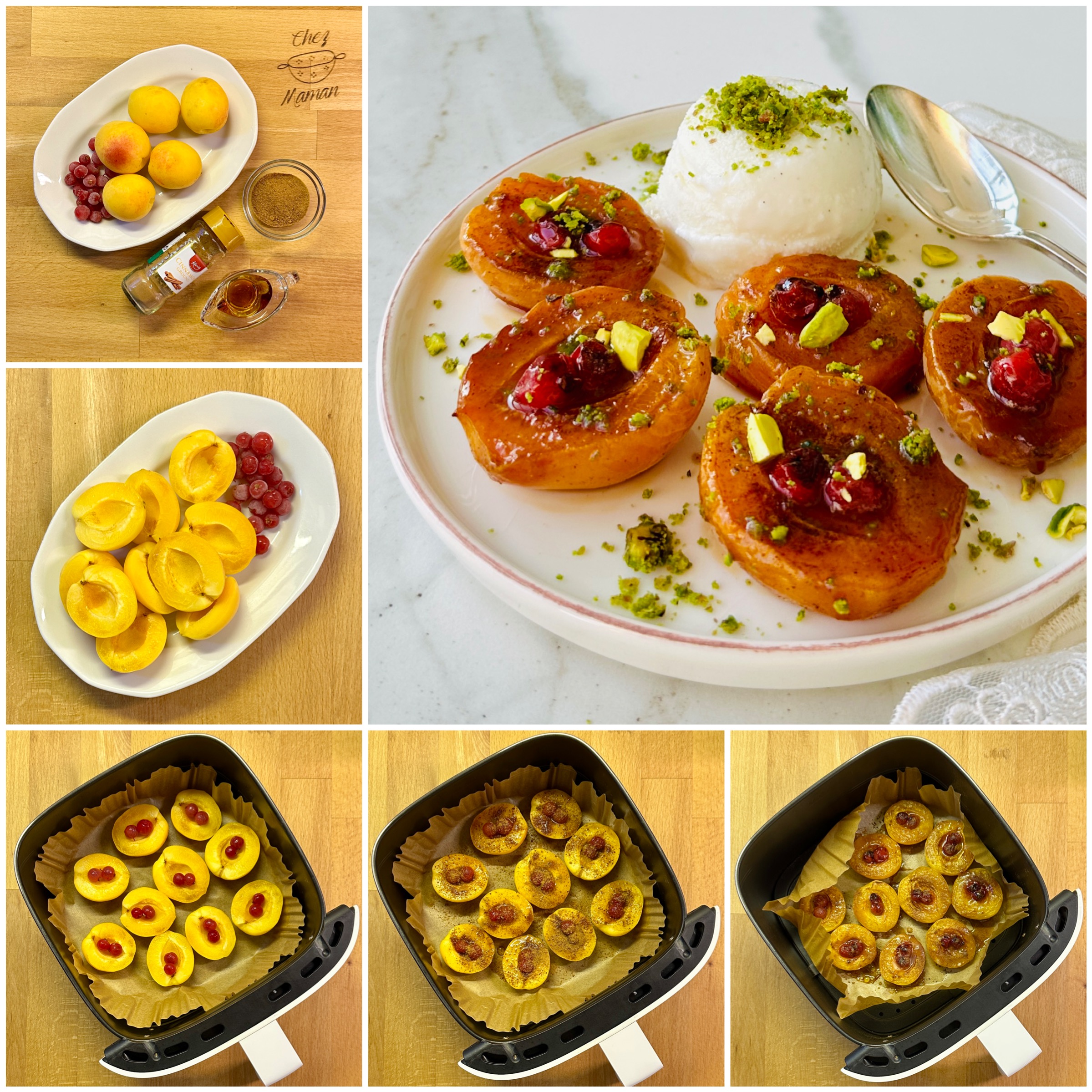*Kayısıları ortadan ikiye bölerek çekirdeklerini çıkartın. Oyuk tarafı yukarı gelecek gibi aifriyer haznesine yerleştirin. Oyuklara frenk üzümü veya yaban mersinlerini pay edin. Üzerlerine sırayla mapple şurup, şeker ve tarçını serpiştirin.