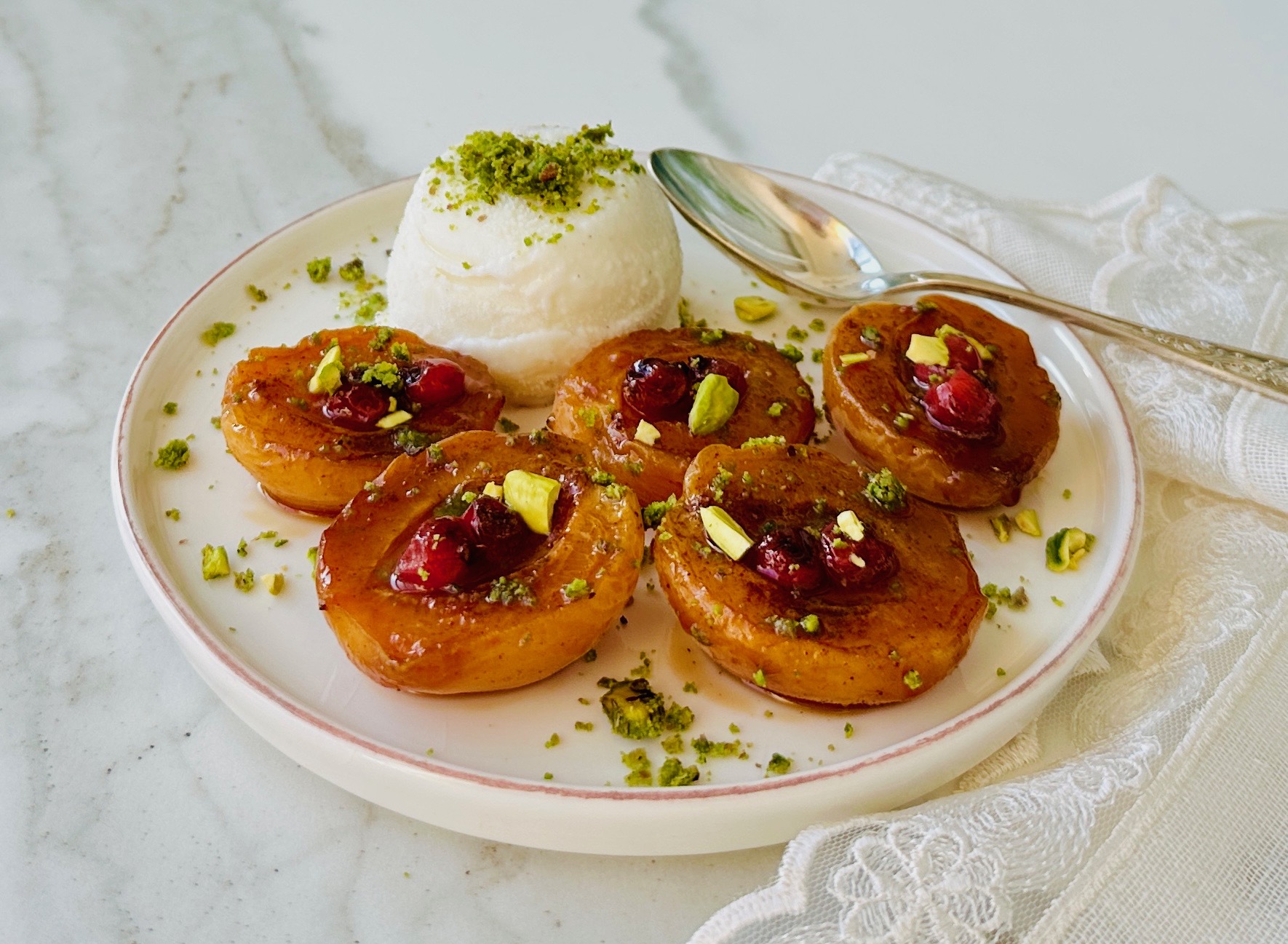 Kayısı ve orman meyvelerinin tatlı & ekşi uyumuyla çok lezzetli olan karamelize kayısı tatlısının yanına vanilyalı dondurma çok yakışıyor…