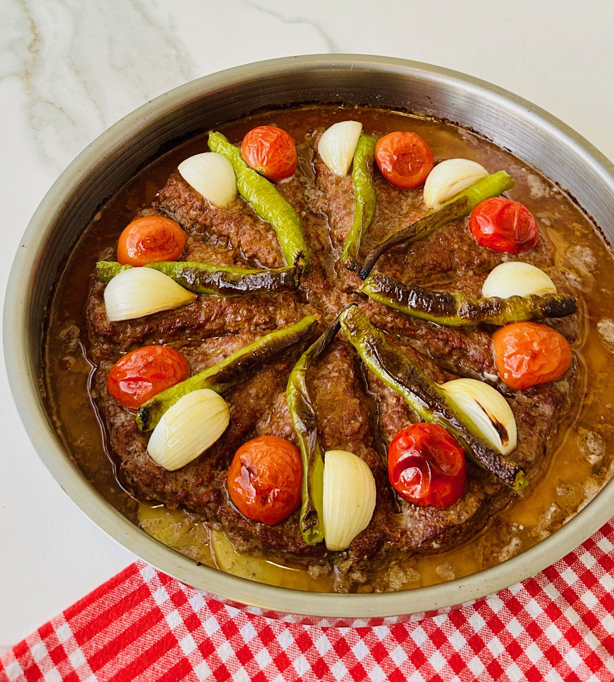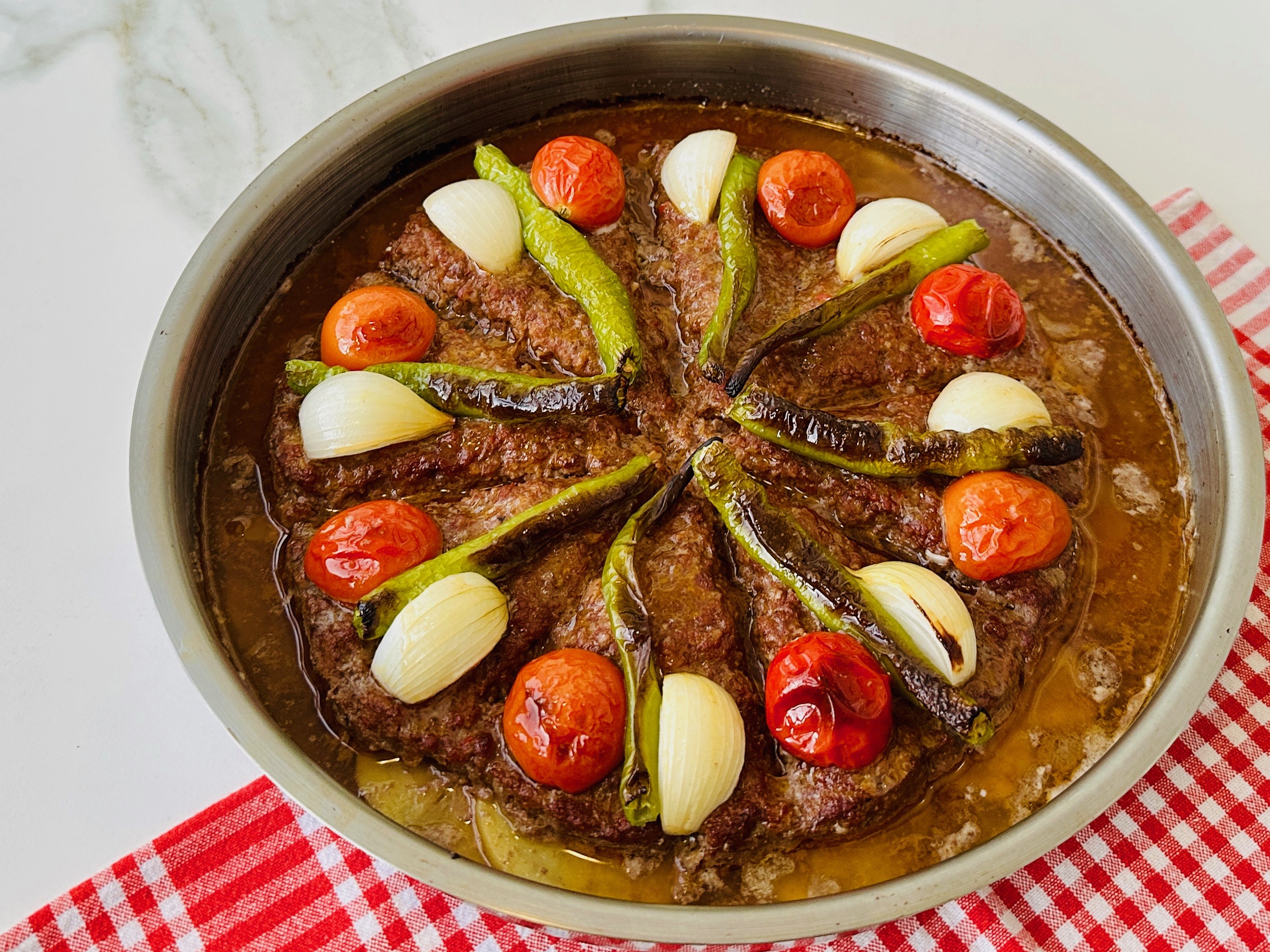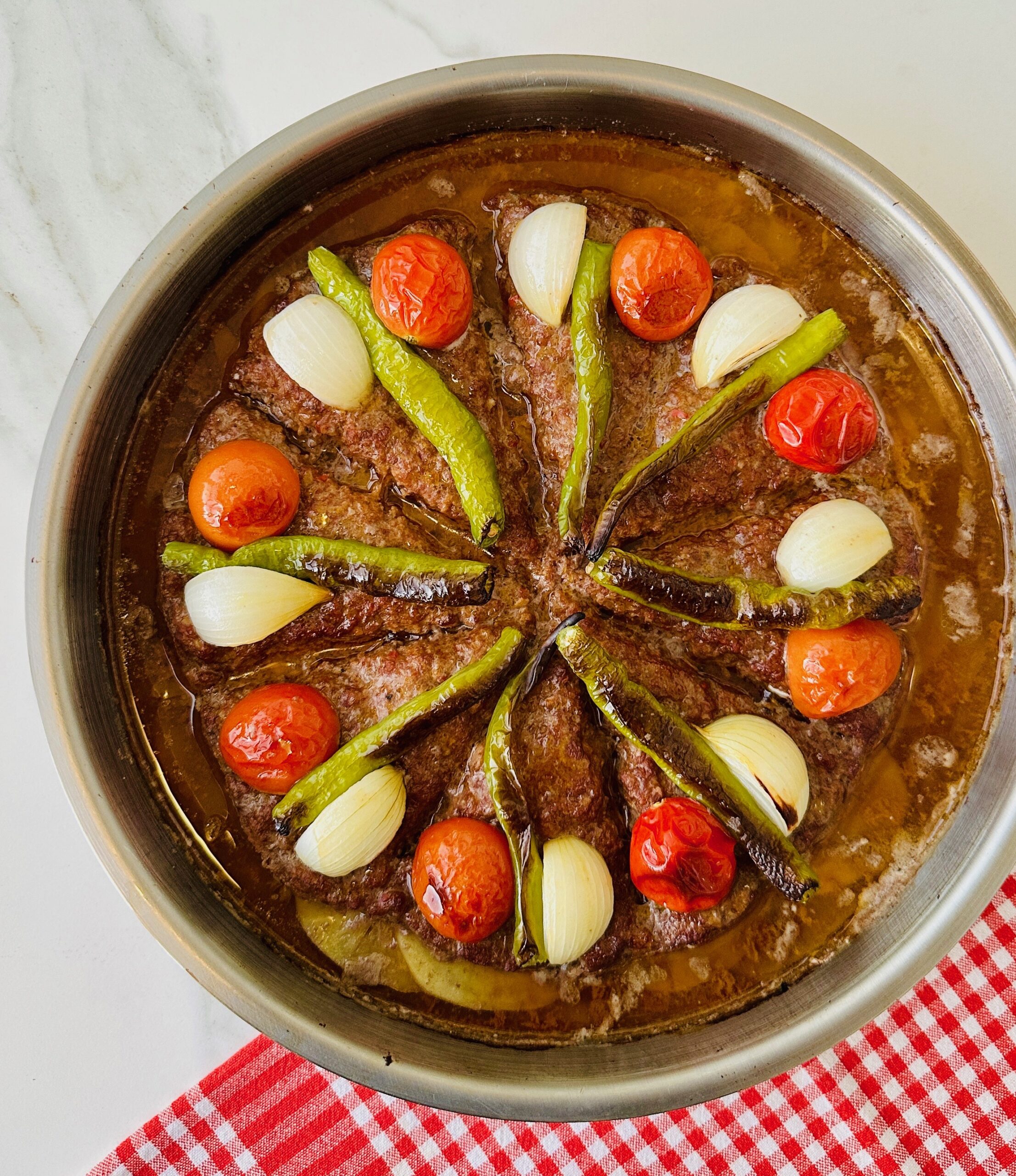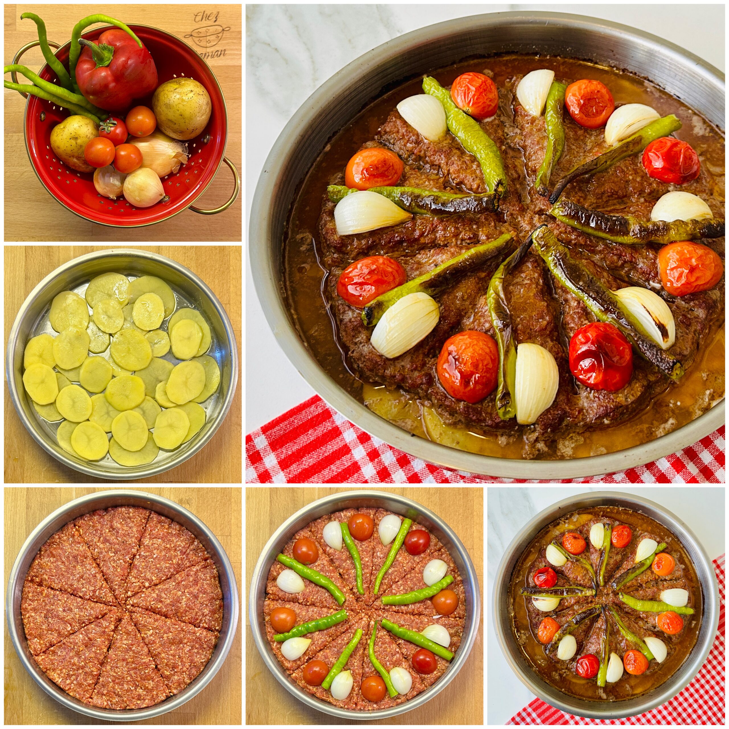 *Çeri domates ve biberleri ikiye bölün, kuru soğanların kabuklarını soyarak her birini dörde bölün, kıymalı harcın üzerine görseldeki gibi yerleştirin.