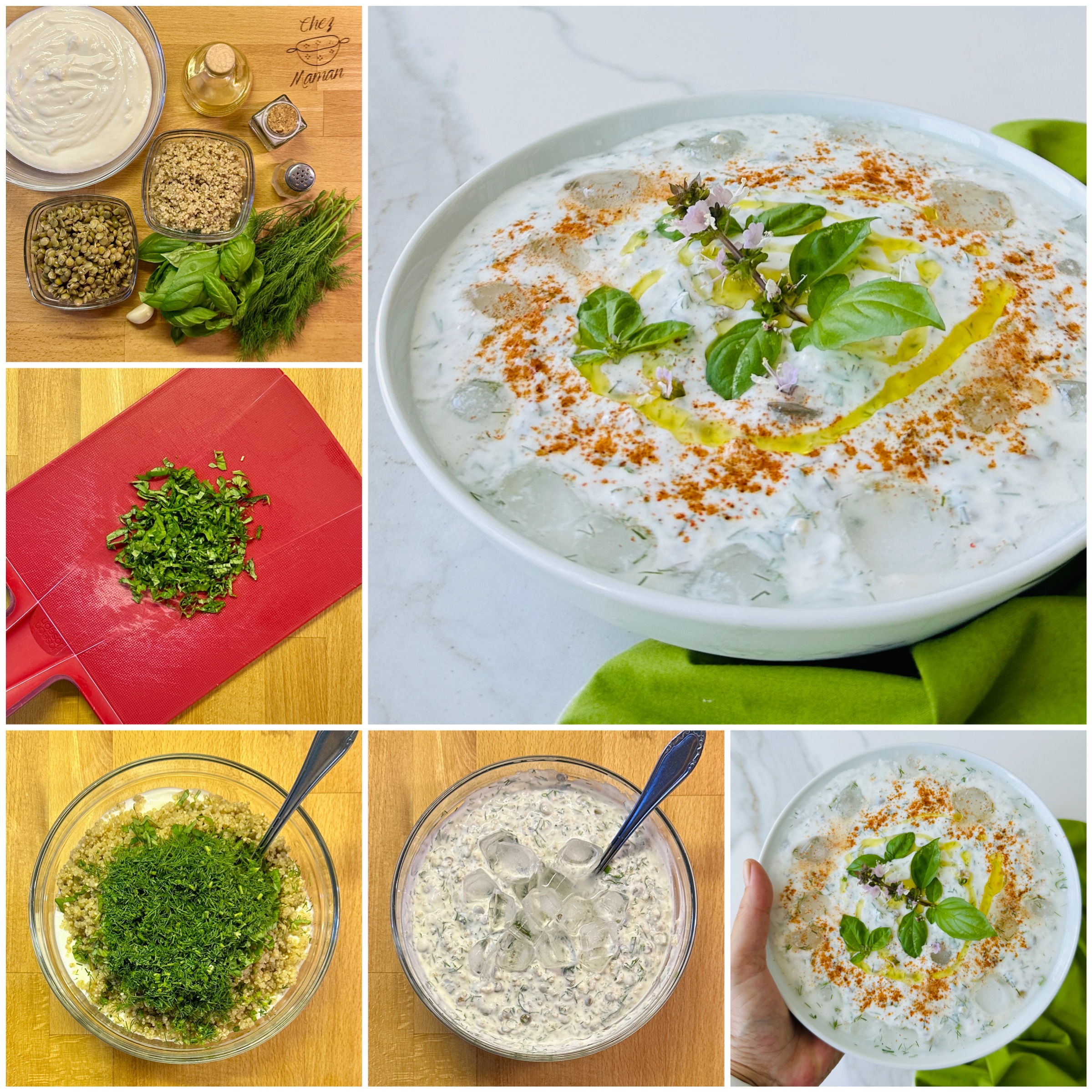 *Yoğurdu büyük bir kaseye alarak karıştırın, sarımsak, kinoa, mercimek, tuz, dereotu, fesleğen ve buzu ilave ederek karıştırın.