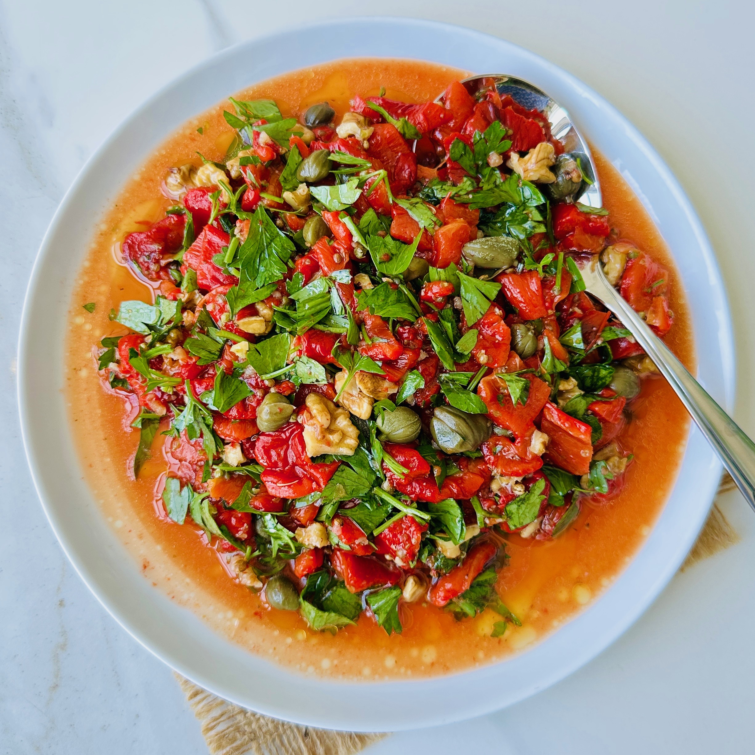 Kahvaltı sofraları için veya iştah açıcı olarak hazırlayabileceğiniz kişnili, kaparili ve cevizli kapya biberli leziz meze…