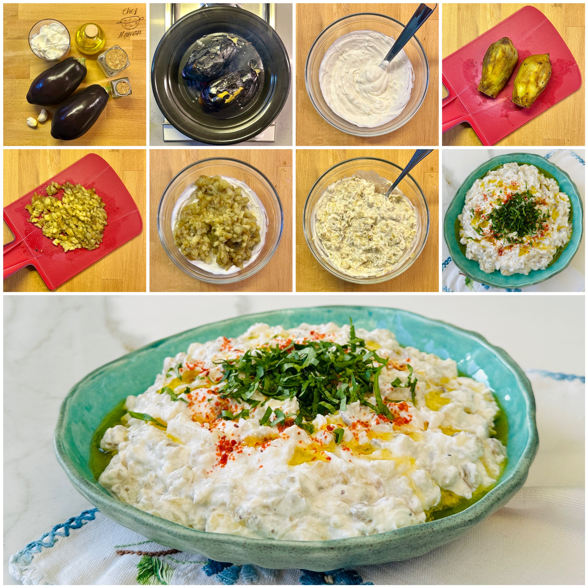 *Közlenmiş patlıcanların kabukları soyarak minik küpler halinde doğrayın ve süzme yoğurtlu karışıma aktarın, kaşık yardımıyla karıştırarak servis tabağına geçirin.