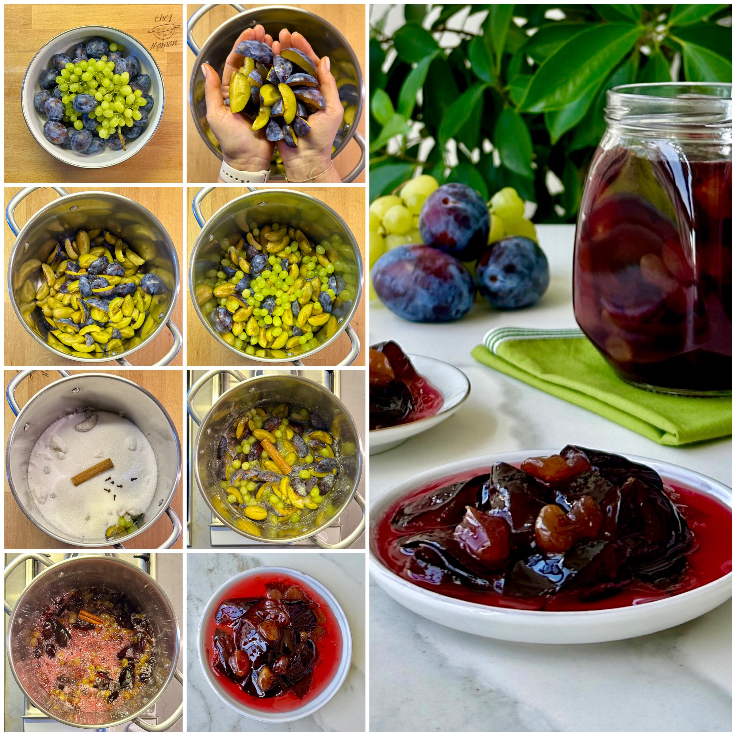 *Meyveleri bol suda yıkayın, mürdüm eriklerini dörde bölün, üzümleri saplarından ayıklayın ve hepsini büyük bir reçel tenceresine alın. Üzerlerine toz şeker, çubuk tarçın ve karanfilleri ekleyin. Meyveler sularını salana kadar en az 4 – 5 saat veya bir gece bekletin.